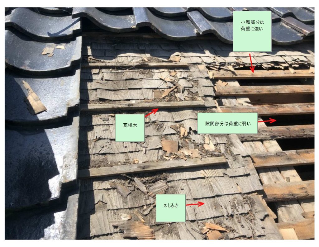 瓦の荷重を支える接地面が「小舞と小舞の隙間」に来ると落ち込みが発生しやすくなります。