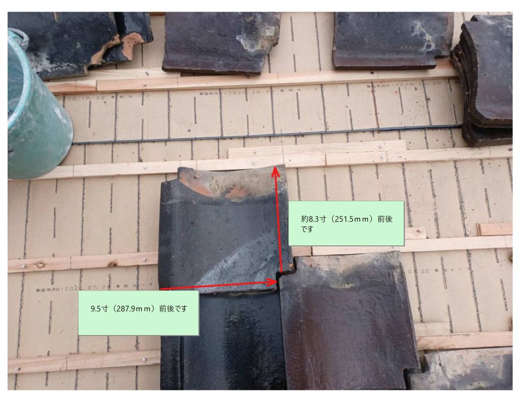 上の写真は、北陸独自の仕様で、富山県小矢部市の「みのわ窯業」で販売されている、銅線で緊結される仕様の「49判」瓦。数字は、1坪当たりの枚数を示します。瓦の枚数で、大まかな屋根の大きさが分かります。