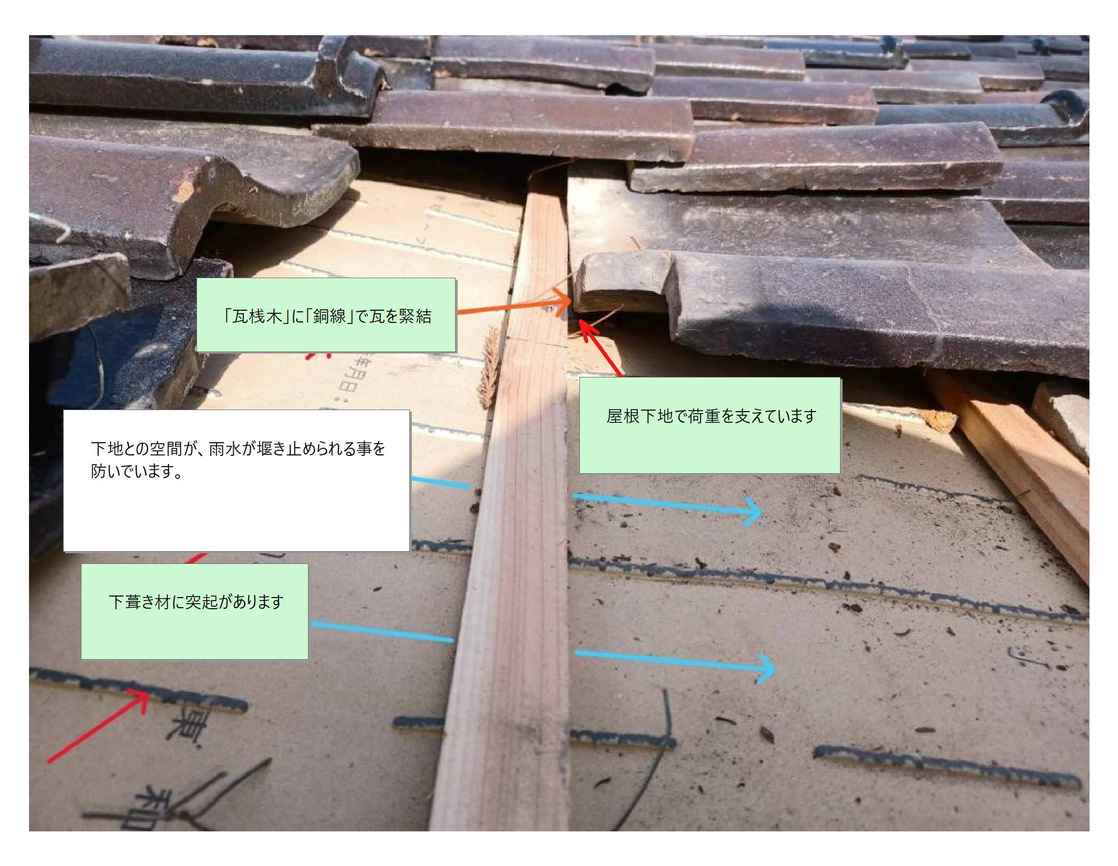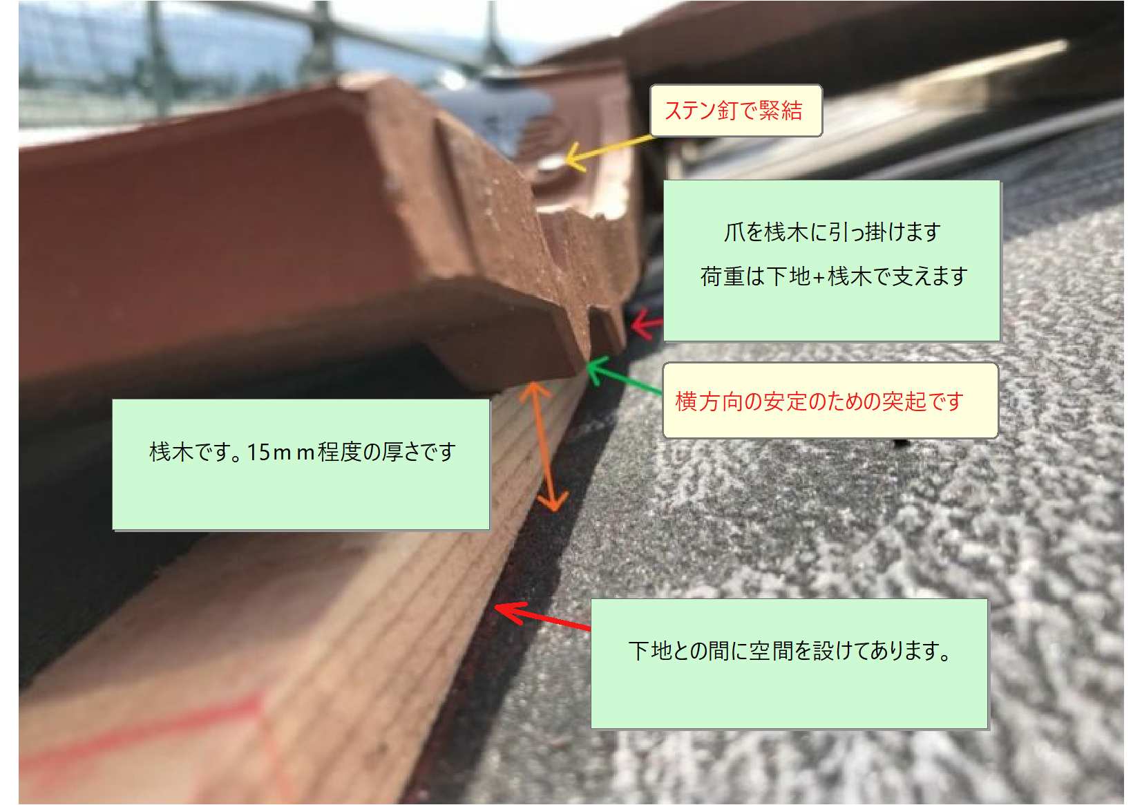 瓦の荷重を「下地・桟木」で支えるので、瓦の落ち込みの心配が少なく「下地」と「桟木」の間に、隙間を設ける事により、下地に入った雨水を軒先方向へ流します。