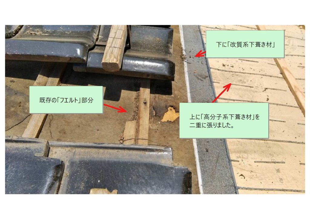 「高分子系下葺き材」に比べ材料費や手間がかかりますが、長い実績があるので安心です。