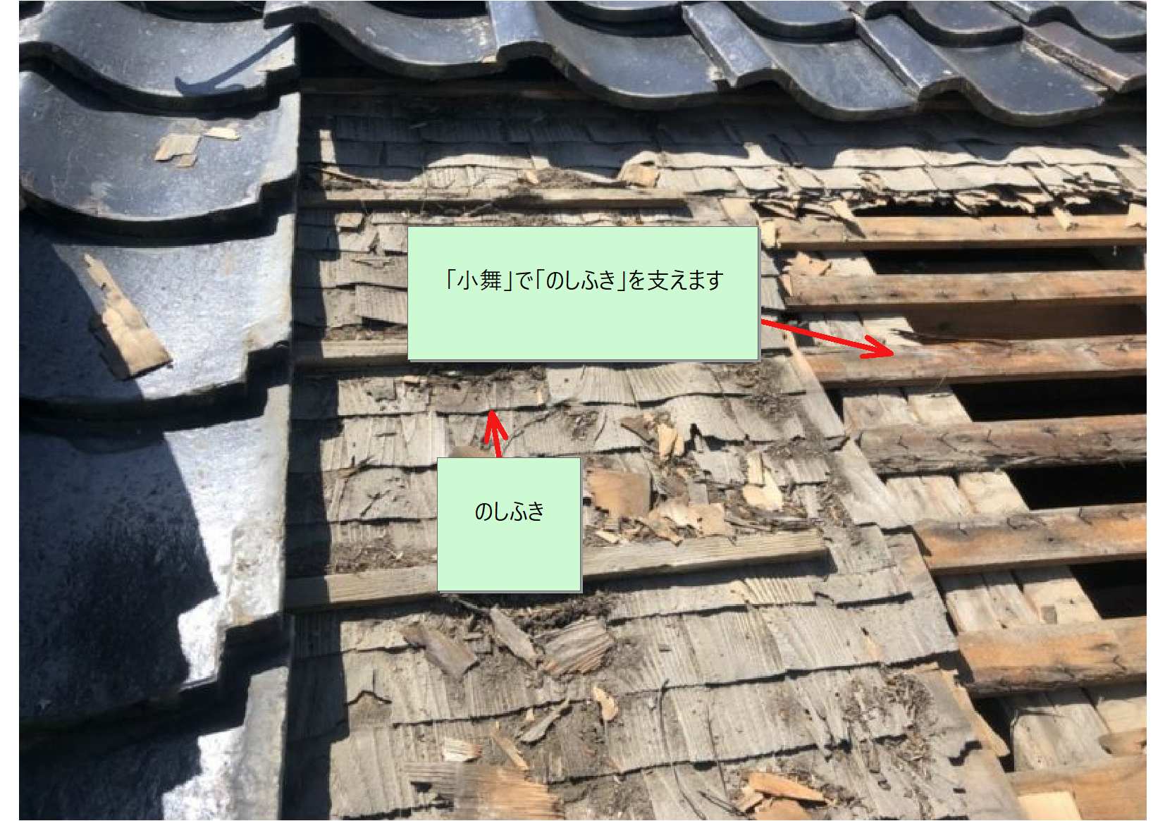 かつては「小舞・こまい」と呼んでいる板に「のし葺き」と呼んでいる「木の薄板」を張り付けるのが一般的でした。