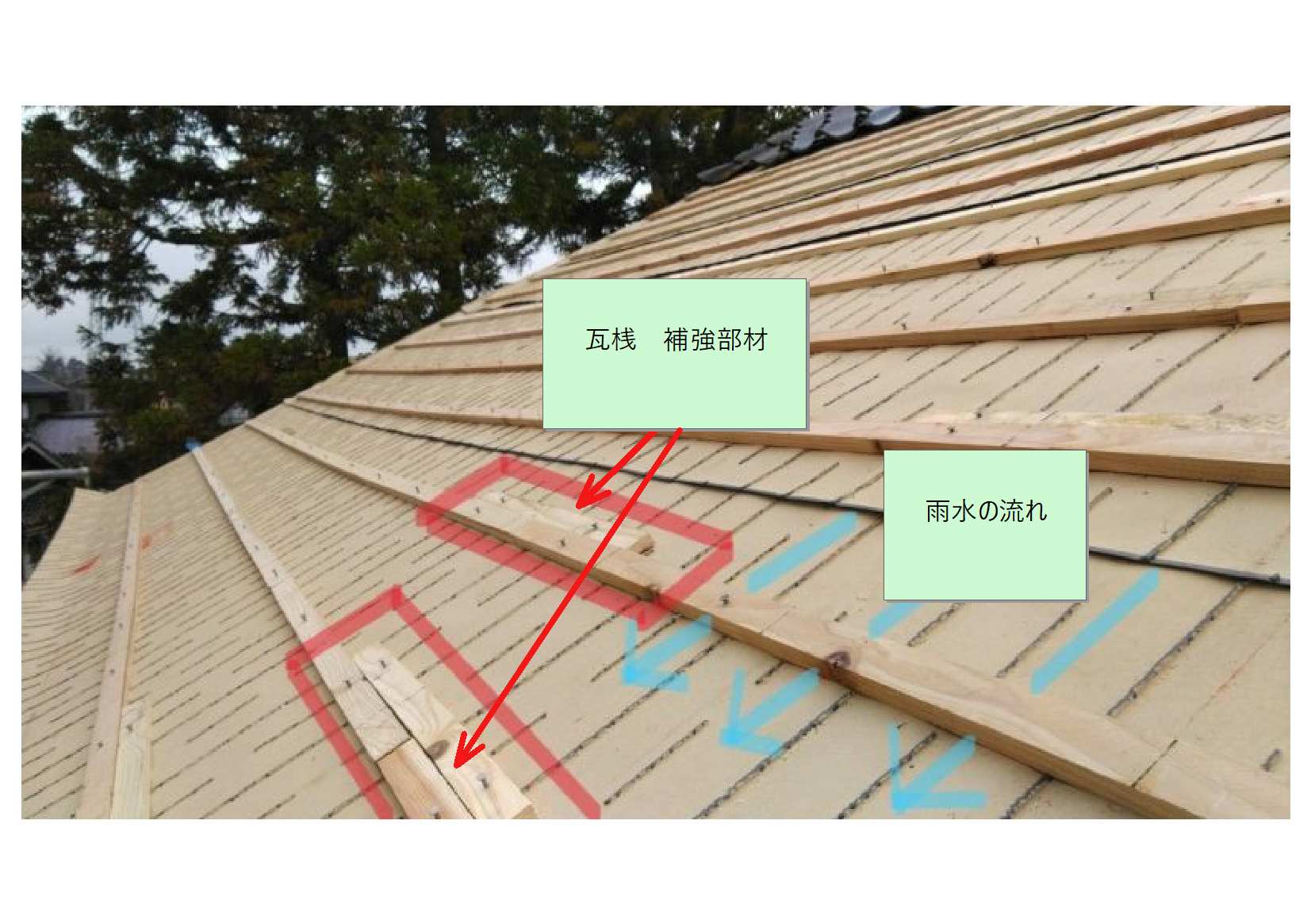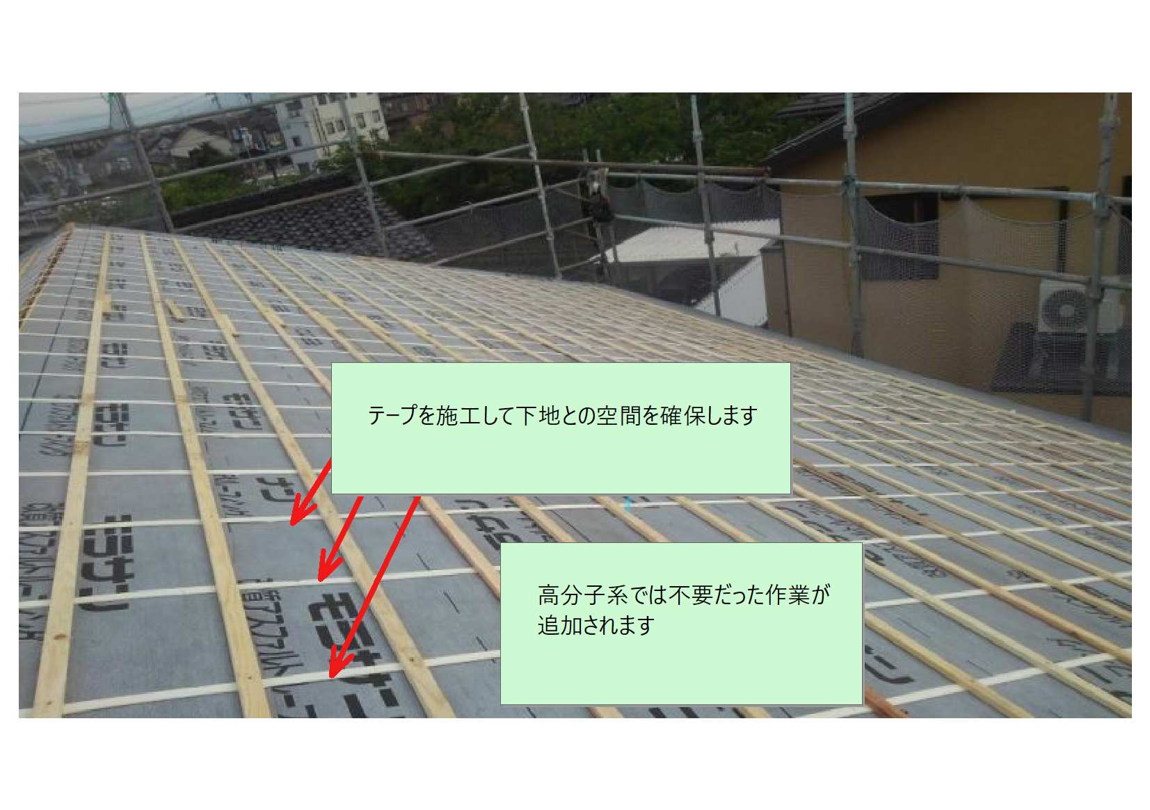 「高分子系下葺き材」に「桟木」を施工した所です。「下地」と「桟木」の空間が確認できます。