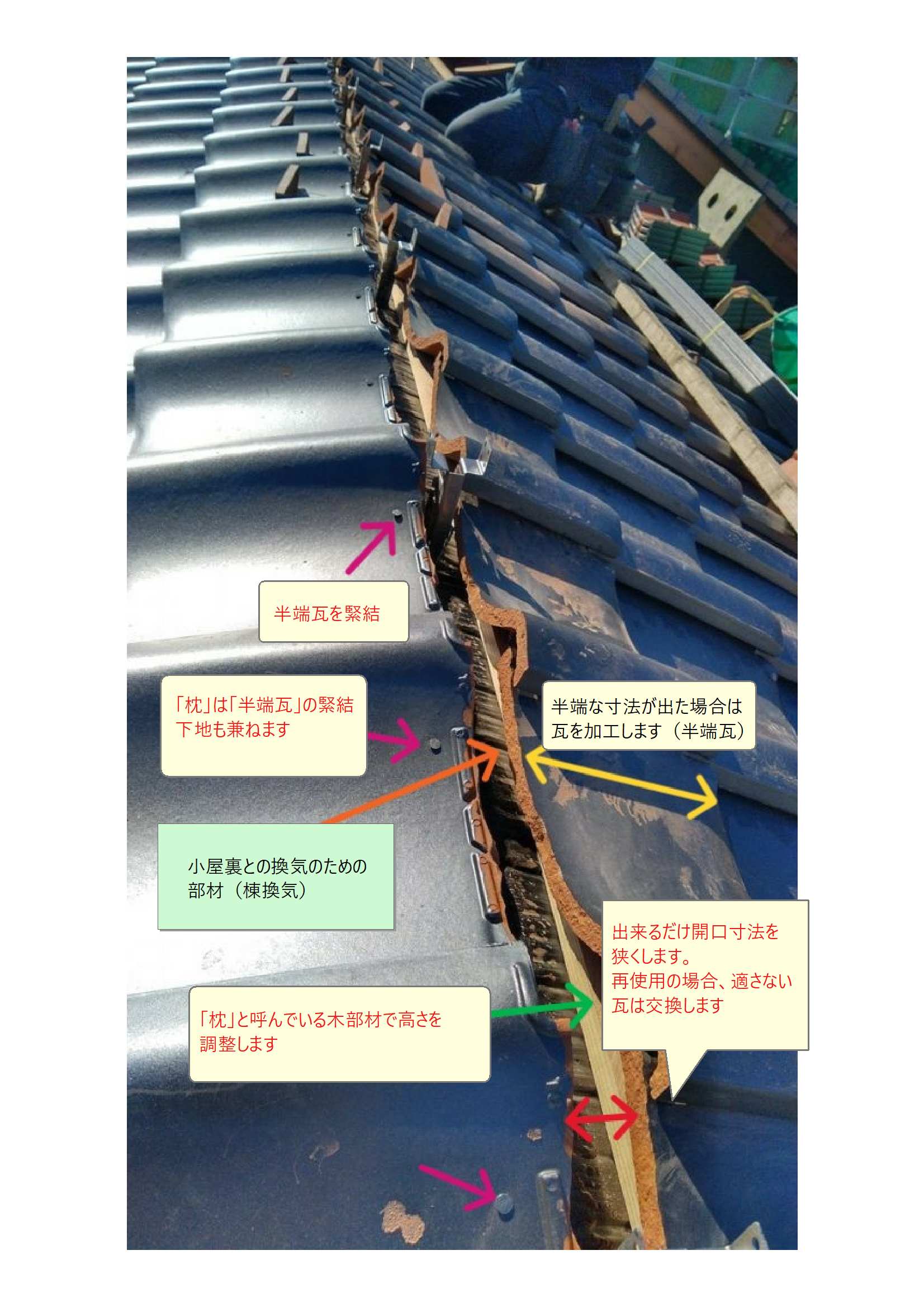 この仕様を「半端瓦」「はんきり」と呼んでおり、メンテナンス工事等で「半端瓦の開口寸法(赤色)が大きすぎる場合」は「切り直し」です。ここまでの作業を「棟の下の瓦締め直し」と呼んでいます。