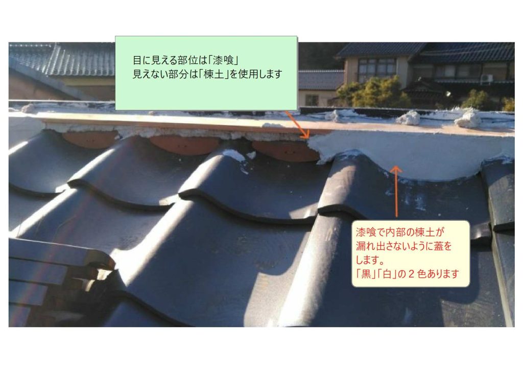「鬼瓦」がない側は「漆喰」で仕上げます。「漆喰」は「初めは黒いが徐々に白く(白華現象)」なります。