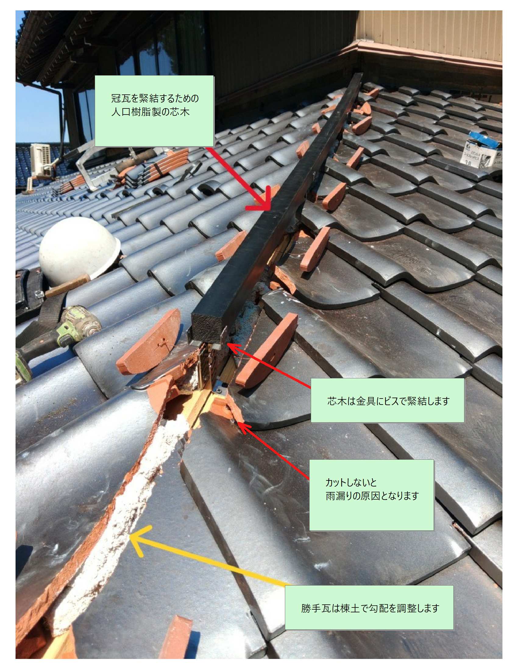 一番上の「冠瓦」を内部の「芯木」にビス止めして「鬼瓦」との隙間はコーキングで防水を確保します。「ビス」の長さは、棟の段数によって使い分けます。「冠瓦」にも「紐」がありますね。