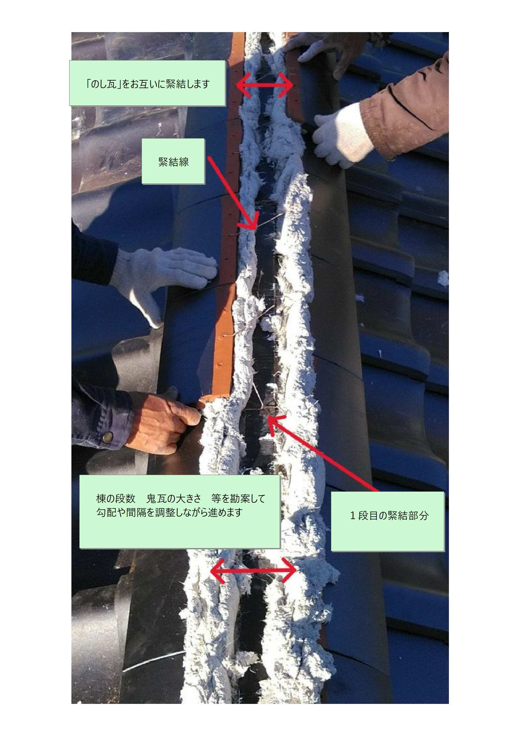 お互いの「のし瓦」を緊結していきます。前述した「銅線が長すぎても短すぎてもダメ」ですね!