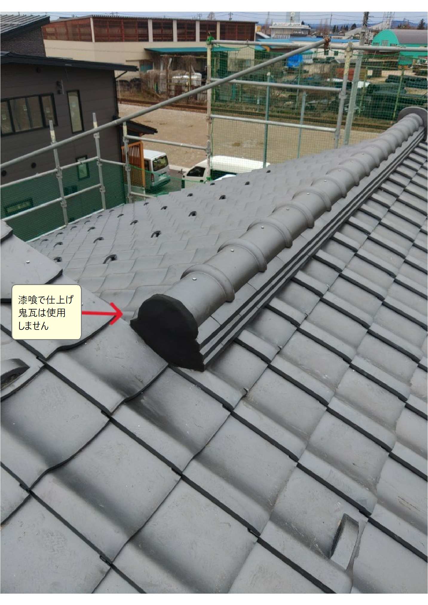 鬼瓦を取り付ける位置は「会社」や「地域」によって違う場合があり、赤い矢印部分で取り付ける場合もあります。