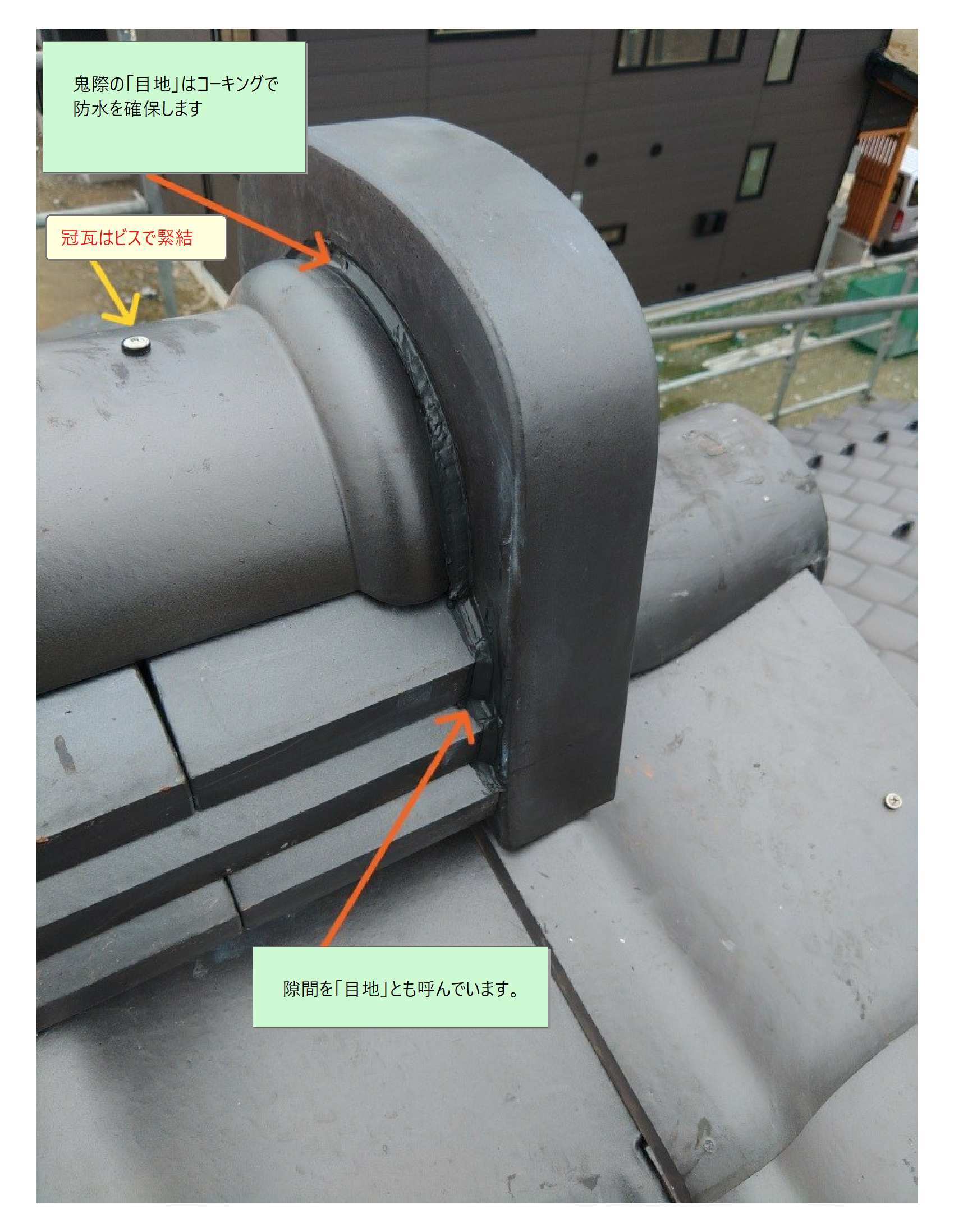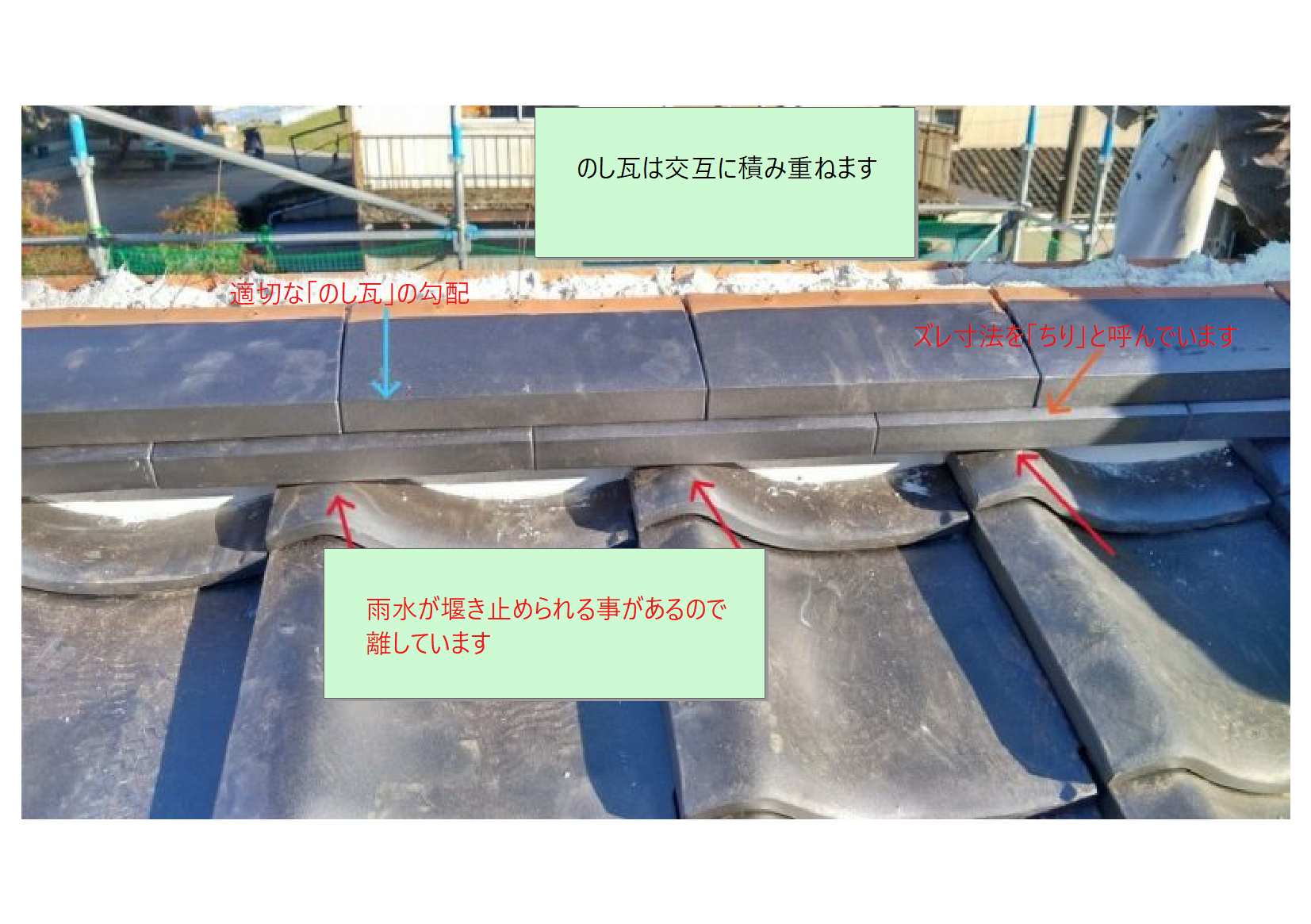 「赤色」の部位では「のし瓦」を横方向に伝う雨が「葺いてある瓦」に堰き止められるのを防ぐため、離れている必要があります。