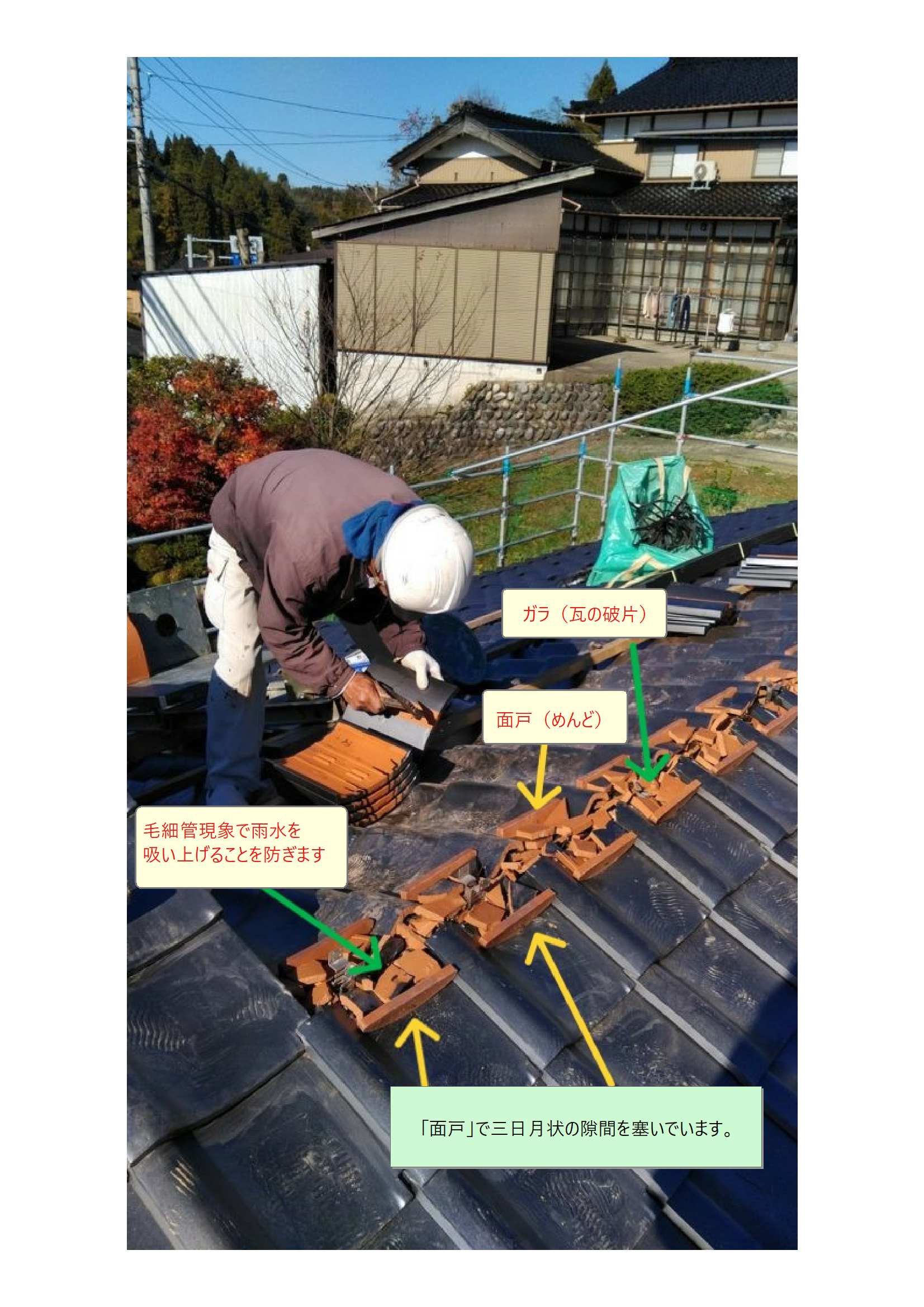 瓦の半月状の隙間を塞ぐ素焼き状の瓦を「面戸・めんど」と呼んでいます。内部に「毛細管現象による雨水の吸い上げ」を防ぐ為の「瓦のかけら・ガラ(緑色)」を隙間なく入れます。