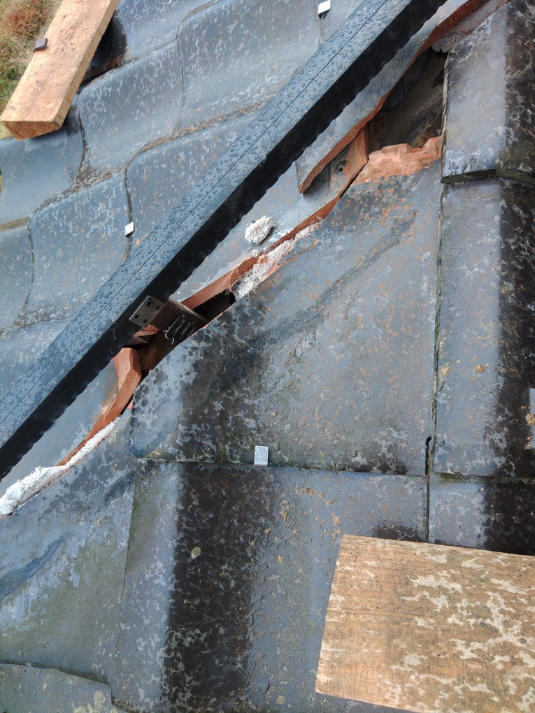 「葺き止め」の場合は「葺き止め下地(外壁)」と「のし瓦」を、緊結します。「棟部の劣化」が進むと緊結が解け「のし瓦」が欠落します。
