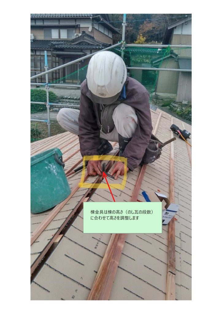 「瓦桟の施工」の際に「棟部」に「芯木」を取り付ける「棟金具」を施工します