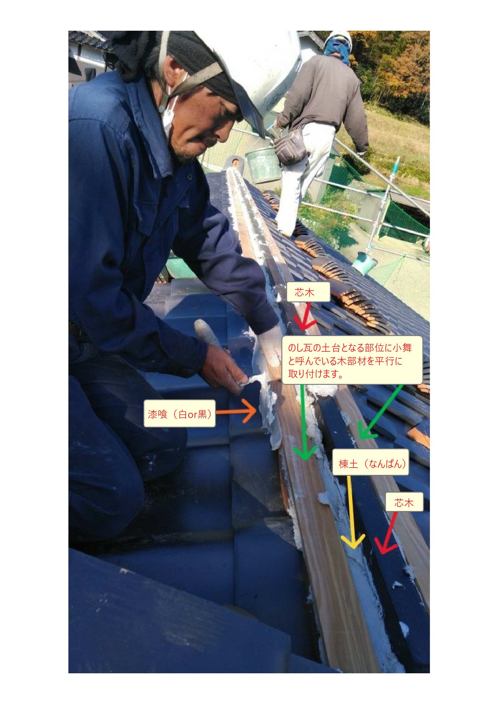 「瓦葺きが終わってから、棟を積むための準備作業まで」を現場では、単純に「段取り」と呼んでおり「棟工事の中間点」です。