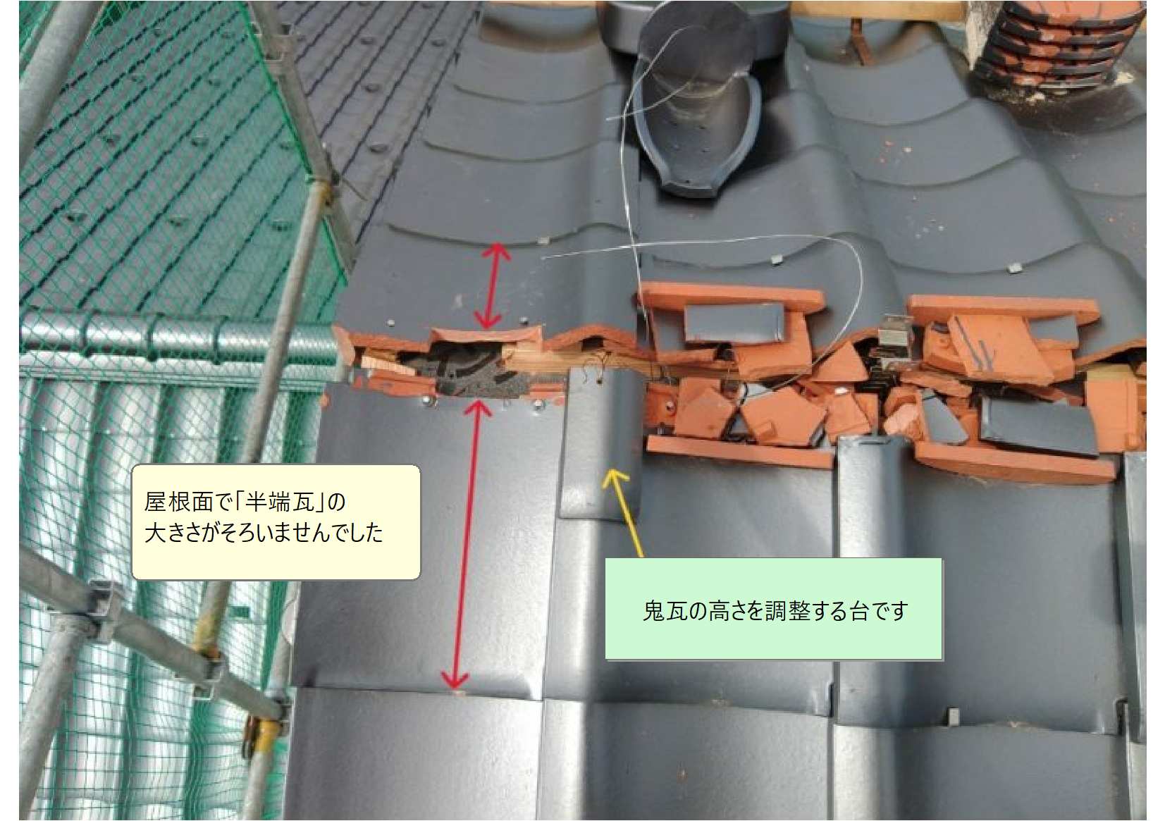 半端瓦の寸法が異なる場合、黄色で示した鬼瓦の土台の高さが左右で異なってしまいます。