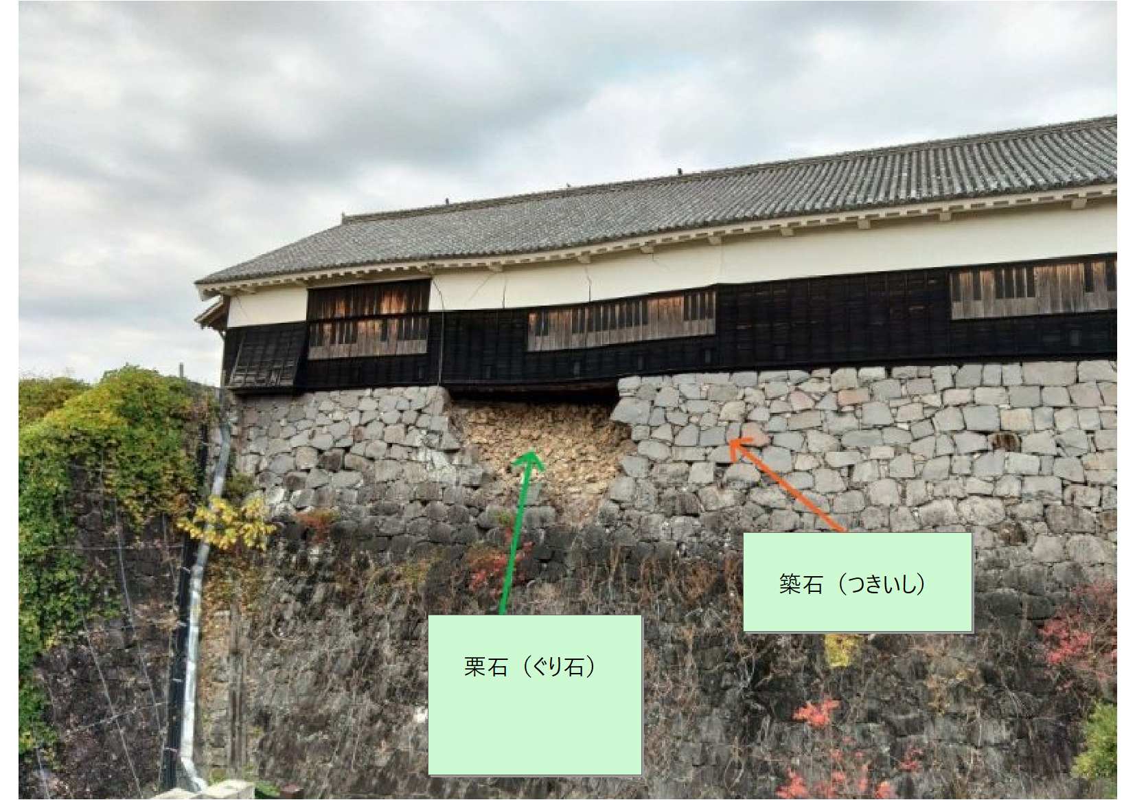 余談ですが、石垣の内部にも水はけを良くする工夫として細かな石「栗石・ぐりいし」が入っており内部の盛り土、外部の「築石・つきいし」という3層構造になっています。