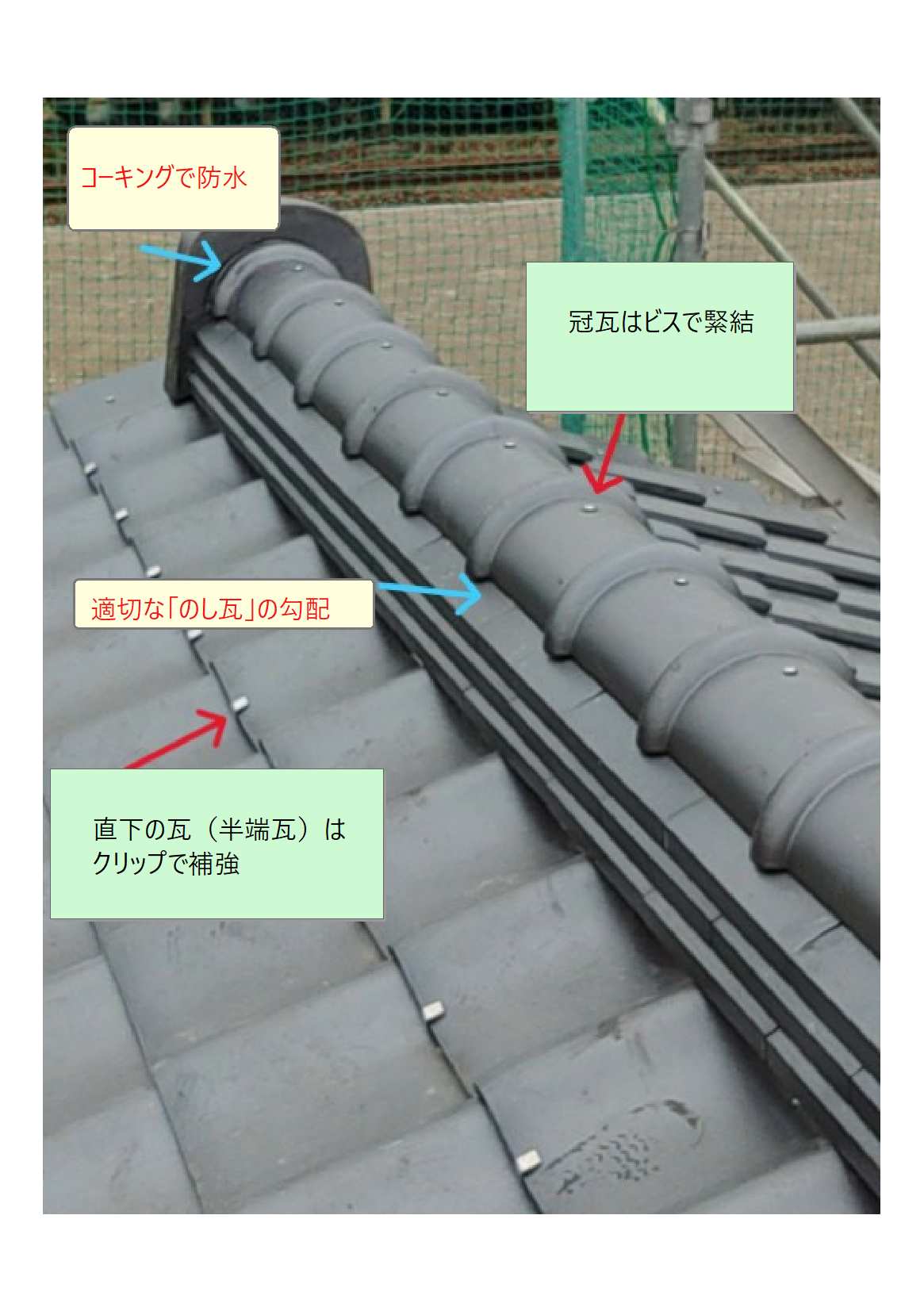繰り返しになりますが、水はけを良くするための「のし瓦の勾配(水色)」にも注意します。「棟部」からの雨漏りの原因の多くは「のし瓦の勾配」不足による「棟土と雨水の接触による毛細管現象」です。