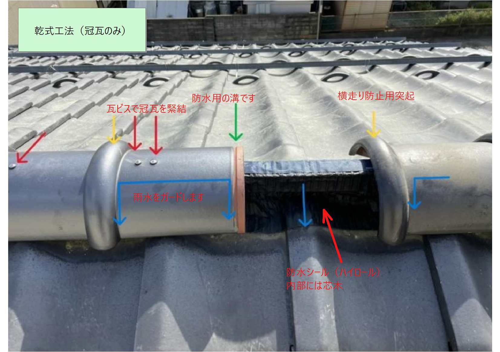 「強力棟工法(乾式)」と呼んでいる「冠瓦のみ」の工法では「面戸」や「ガラ入れ」を施工せず「芯木」に「ハイロール」というシールで防水を確保して「ビス」で「冠瓦を緊結」します。