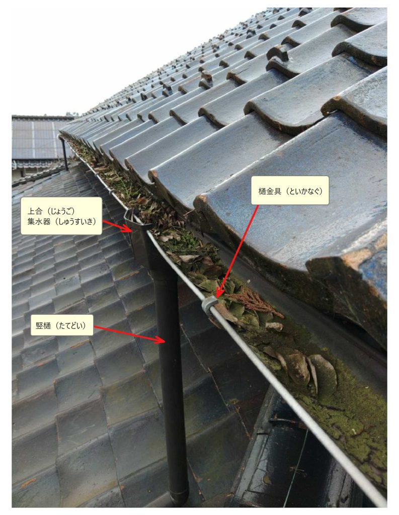 屋根の上を流れた雨水は軒先の「雨樋」である「軒樋(のきとい)」へ流れ込みます。