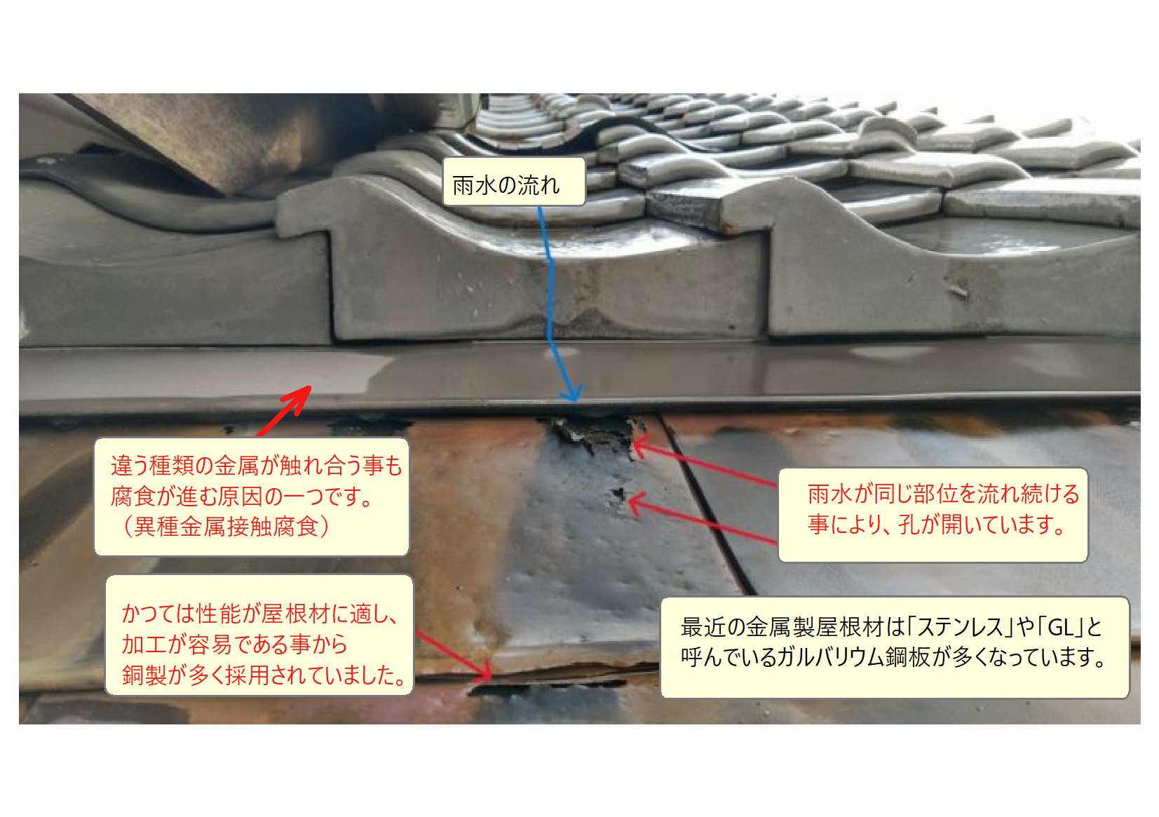 しかし、主に下地の経年劣化等が原因で、雨水が「谷芯」を流れない場合もあります。