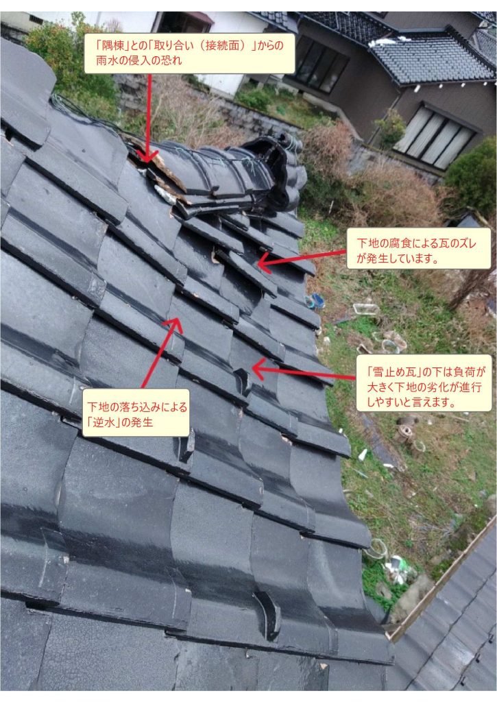 屋根雪に「押される」「引っ張られる」事による「下地の劣化・破損」瓦の「ズレ」や「ワレ」を起こす事があります。