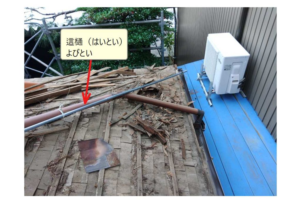 「軒樋(のきとい)」の雨水は「上合」から落とし込まれて「竪樋」を通って地上方面へ流れて行きます。