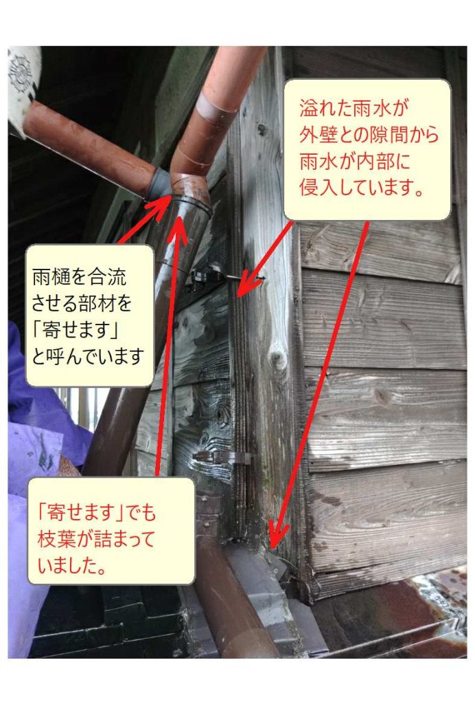「樋」が枝葉で詰まる等で流れが悪くなると雨水がオーバーフローを起こし、下地を痛めます。