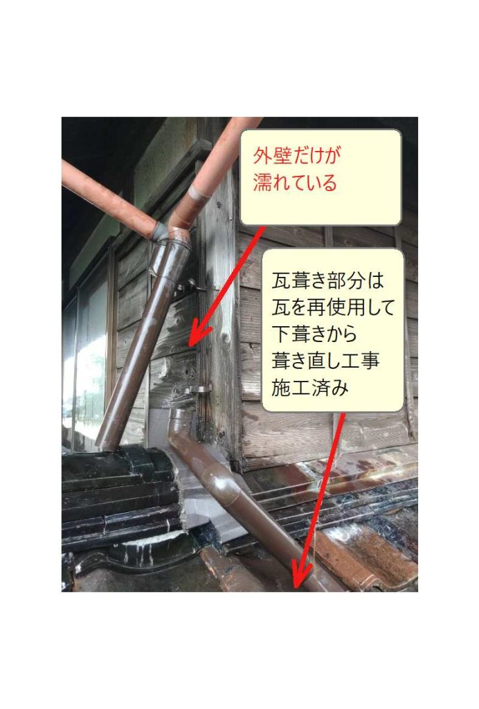 残念ながら雨漏りは止まらず「瓦葺き部分」に濡れは無かったことから、雨水は外壁から直接、直下に侵入していると考えられます。