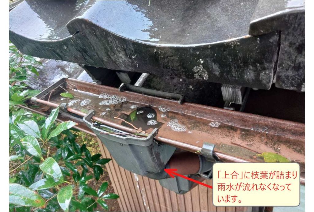 雨水の落とし口である「上合(じょうご)」が、詰まって雨水があふれ出しています。