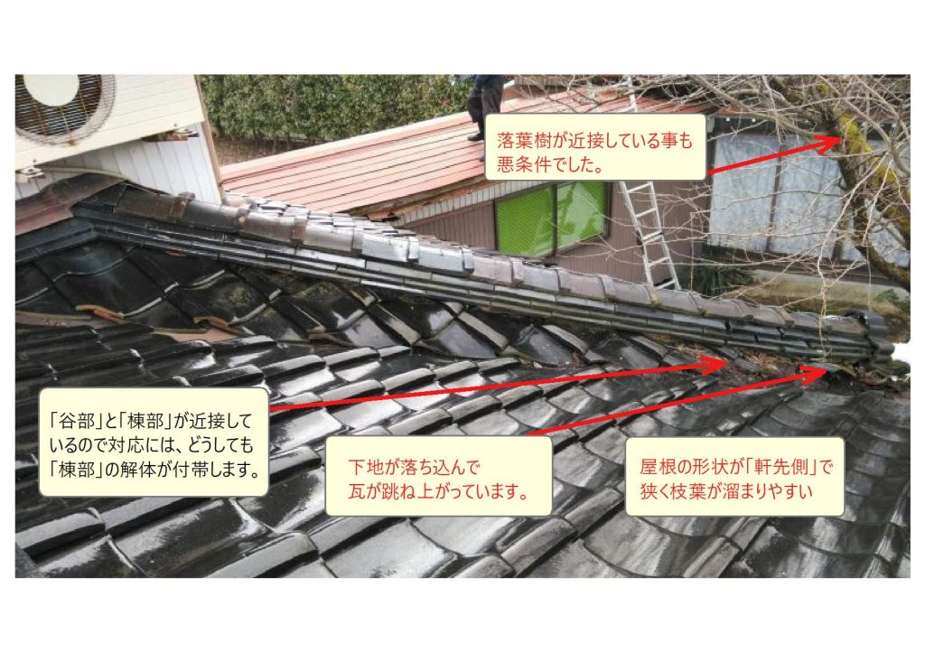 「谷部」は屋根雪も堆積しやすく、屋根雪の「軒先へ方向への荷重」が、雪止め瓦の有無で不自然となる場合があります。