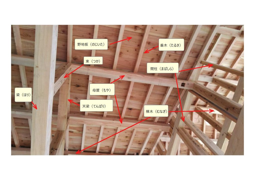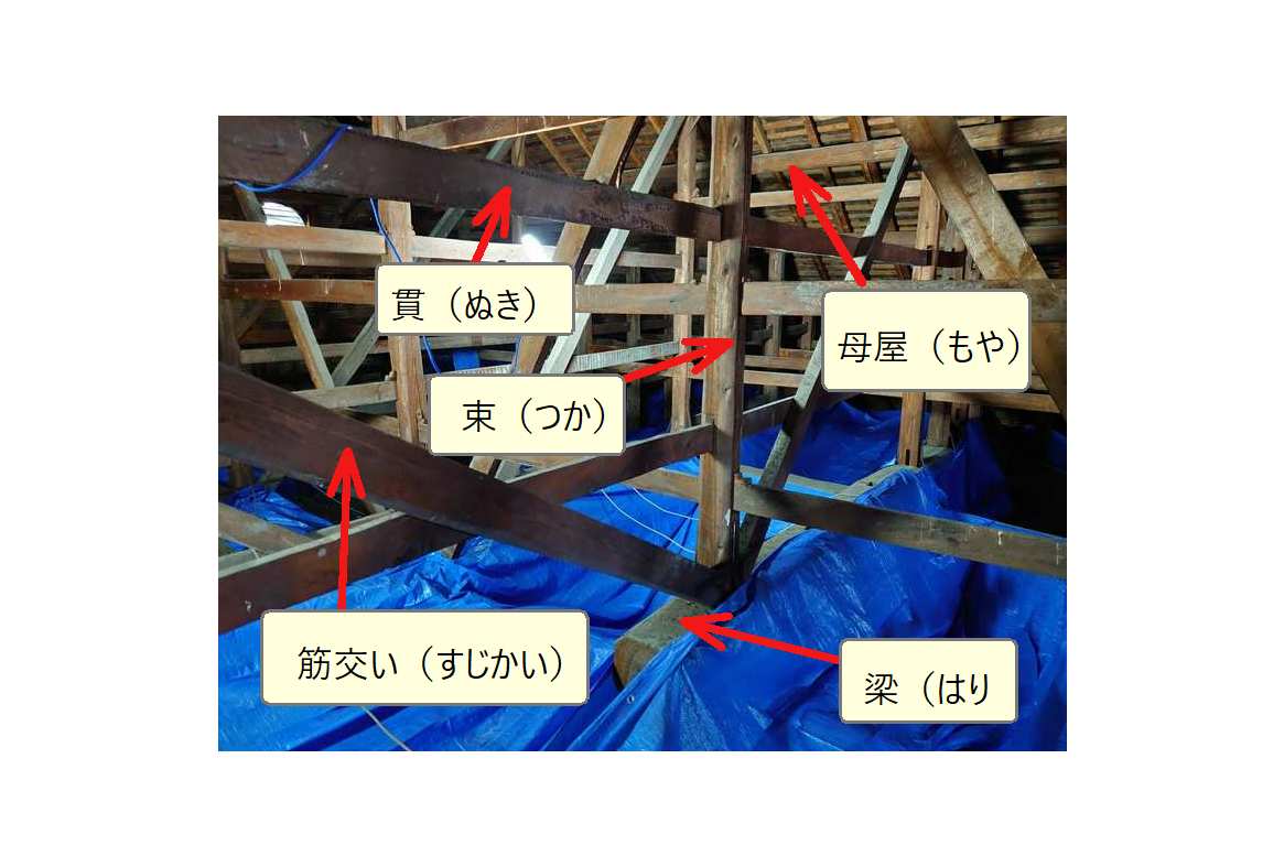 シート横に見えている横架材を「梁・はり」と呼んでおり「梁」の上に「束・つか」を立て「母屋」と「垂木」を支えています。「束」を安定させるために、横方向に「貫・ぬき」斜め方向に「筋交い・すじかい」を補強して「横ブレ」に備えます。シートの下は、天井なので、梁など以外は足を着ける事はできません。