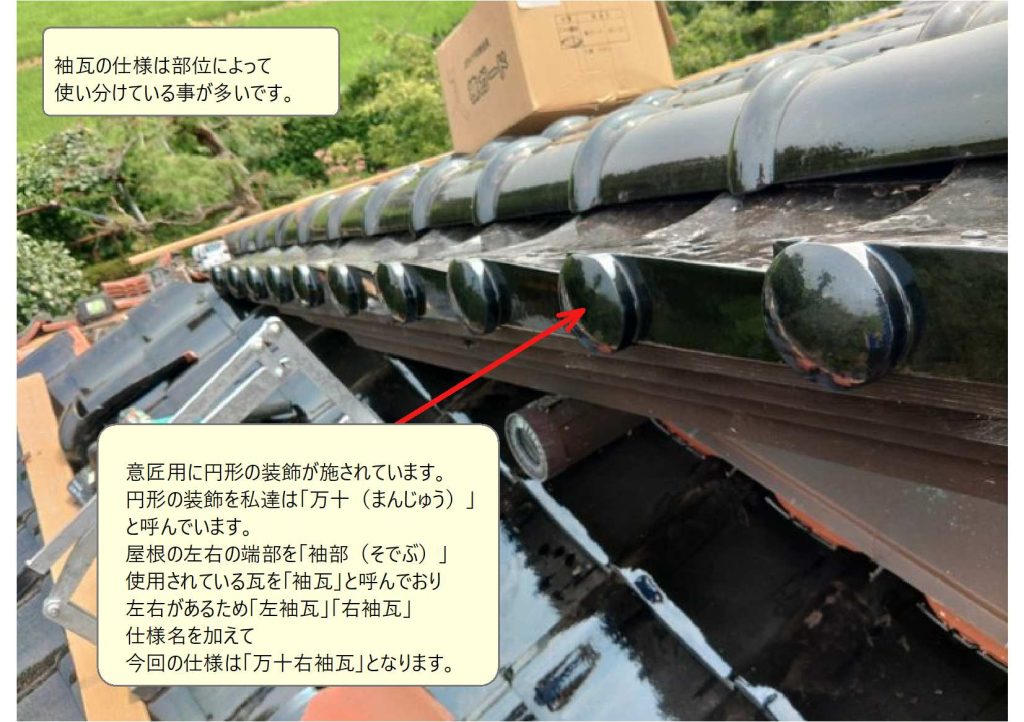 瓦の世界では、丸い突起を「まんじゅう」と呼んでいて、装飾を目的とした仕様です。