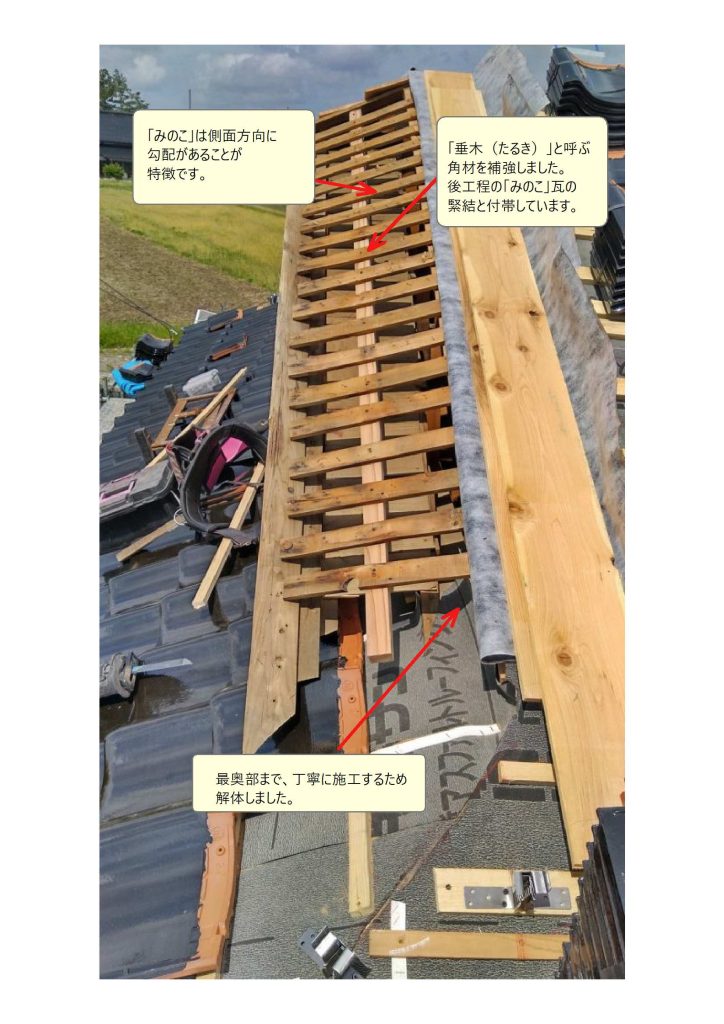 「みのこ」では、下地の状態や勾配がとても重要になります。今回は、勾配を調整し、新たに「垂木」を増設しました。