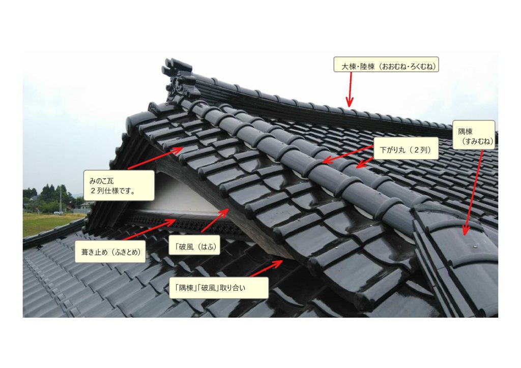 「みのこ」は屋根の端部に勾配を付けて「みのこ瓦」を葺いた仕様です。1列から3列くらいまで見られ、今回は2列の仕様で「二枚みのこ」と呼んでいます。
