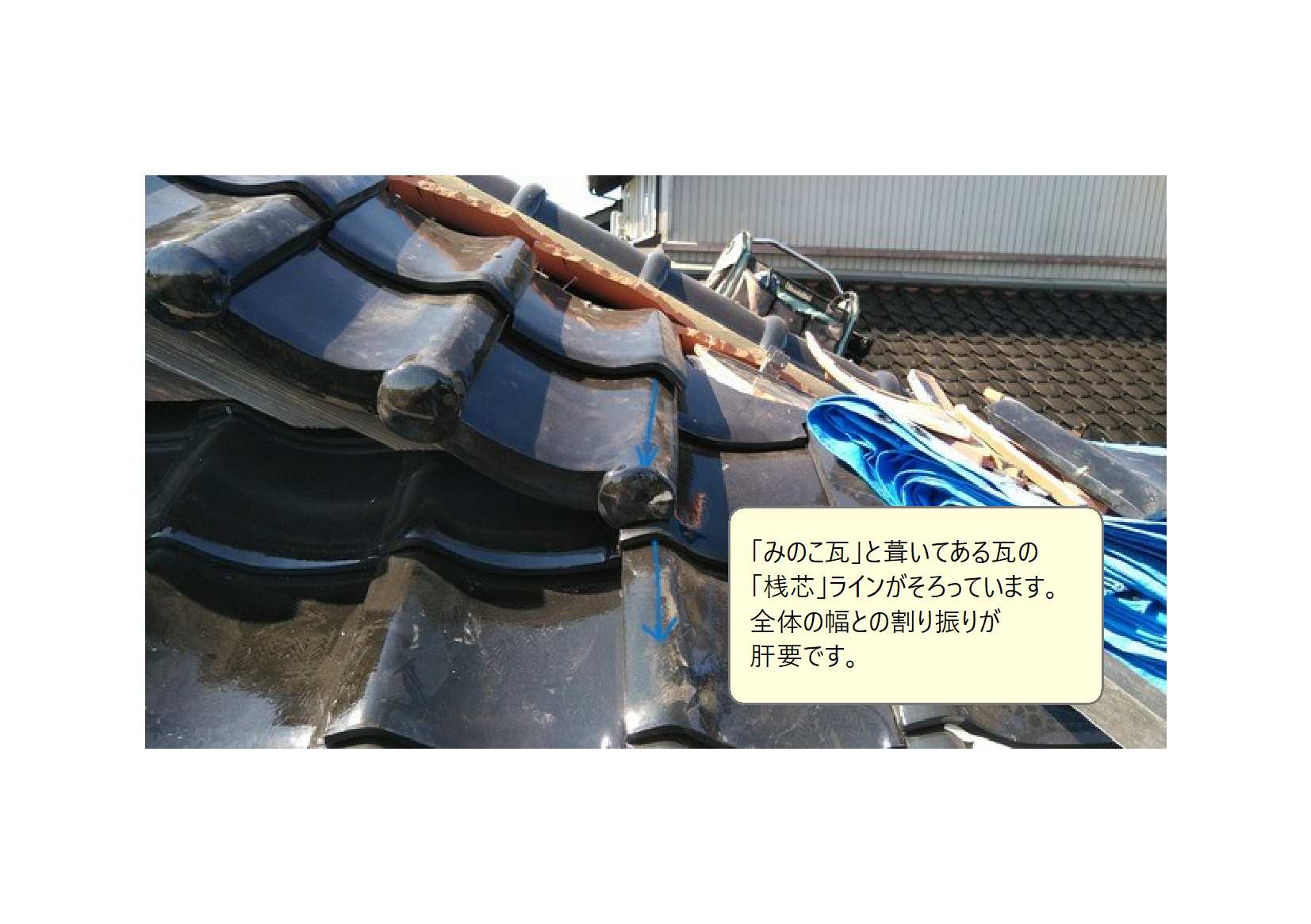 その為には、瓦葺きの際の墨付けを「みのこ」の「桟芯」に合わせて施工する事が必要になります。屋根の形状に合わせた「割り付け」は、職人の技ですね!