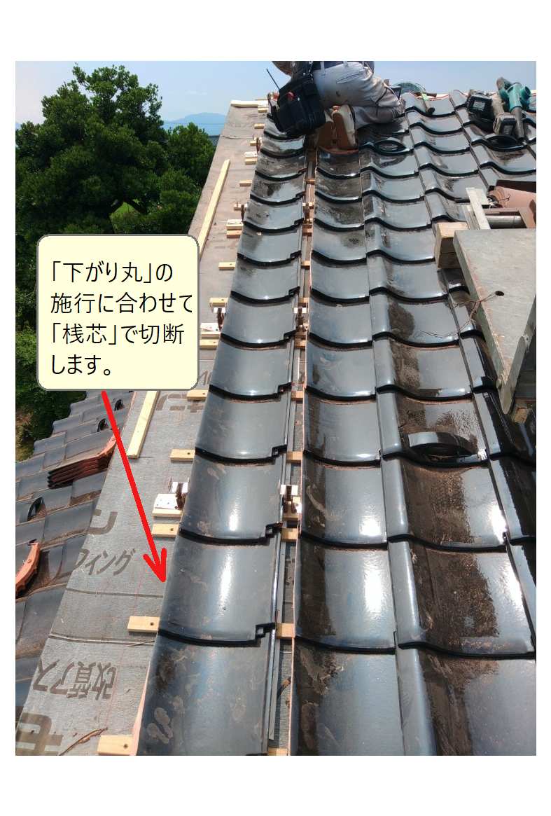 「下がり丸」の周囲では「桟芯」部分から切り落とした「両桟切り」と呼んでいる瓦が施工されています。