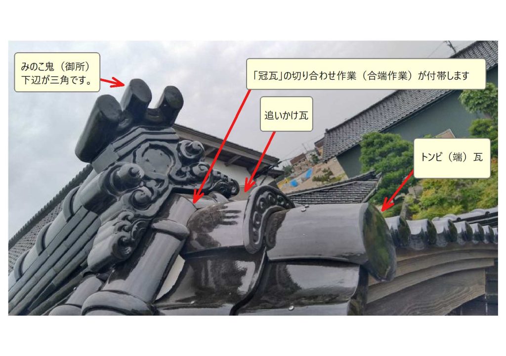 「鬼瓦」は「みのこ鬼」と呼んでいる種類で「みのこ瓦」の「頂部」は「トンビ」「追いかけ」という瓦で納めます。