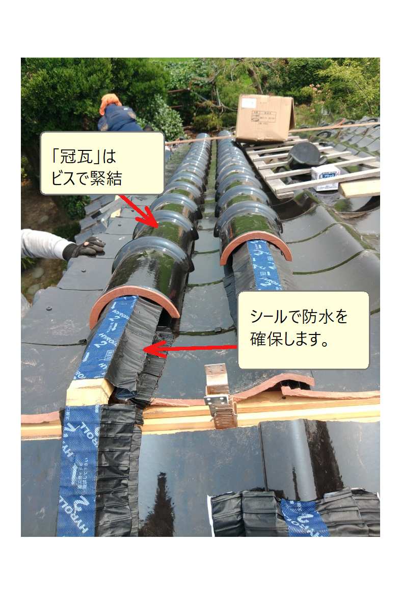 「鬼瓦」から「軒先」にかけて「冠瓦」が施工されています。