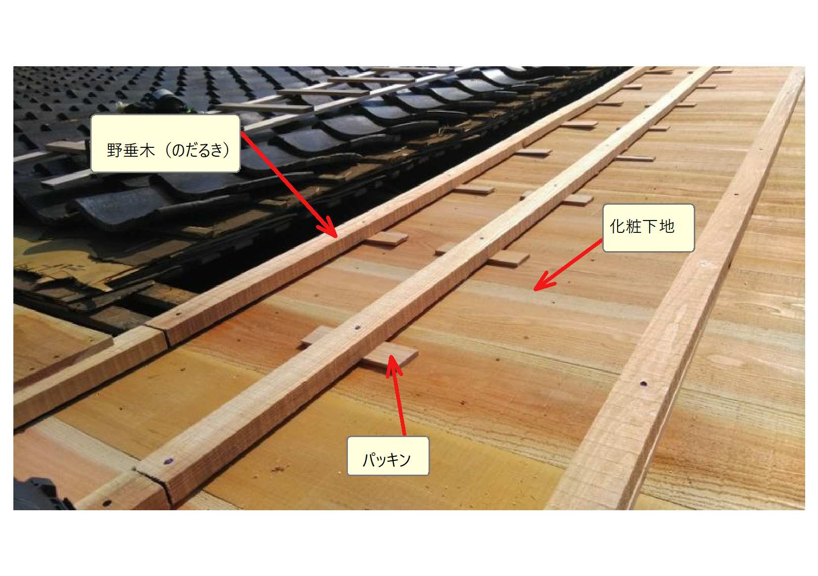 化粧板を施工した後「野垂木・のたるき」という角材を施工して「野地板」を取り付けます。「野垂木」に高さを調整するため「パッキン」を挟んでありますね!構造上「野地板」と「化粧板」の間に空間ができます。