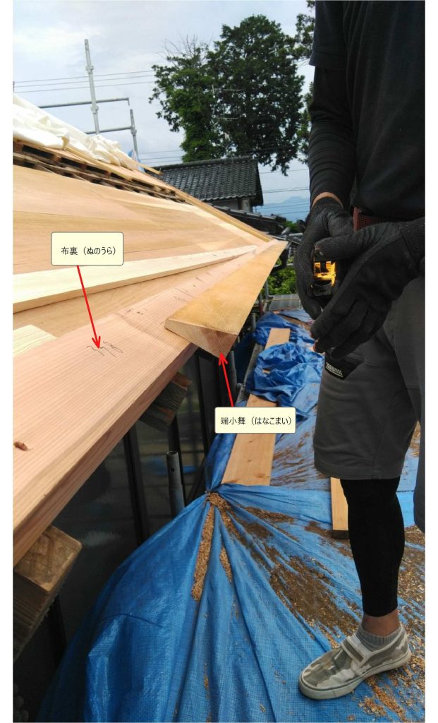 軒先では「布裏」と呼んでいる下地に台形の形をした「端小舞」を取り付けます。これらの仕様は、一般の住宅と同じですね!