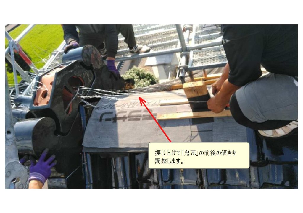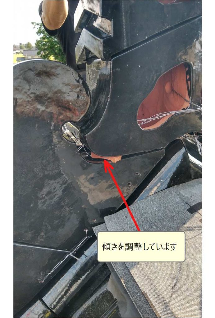 「頭」の位置も定まったら、仮の緊結を締め直し「つっかえ棒」をして、鬼瓦の取り付けは完工です。