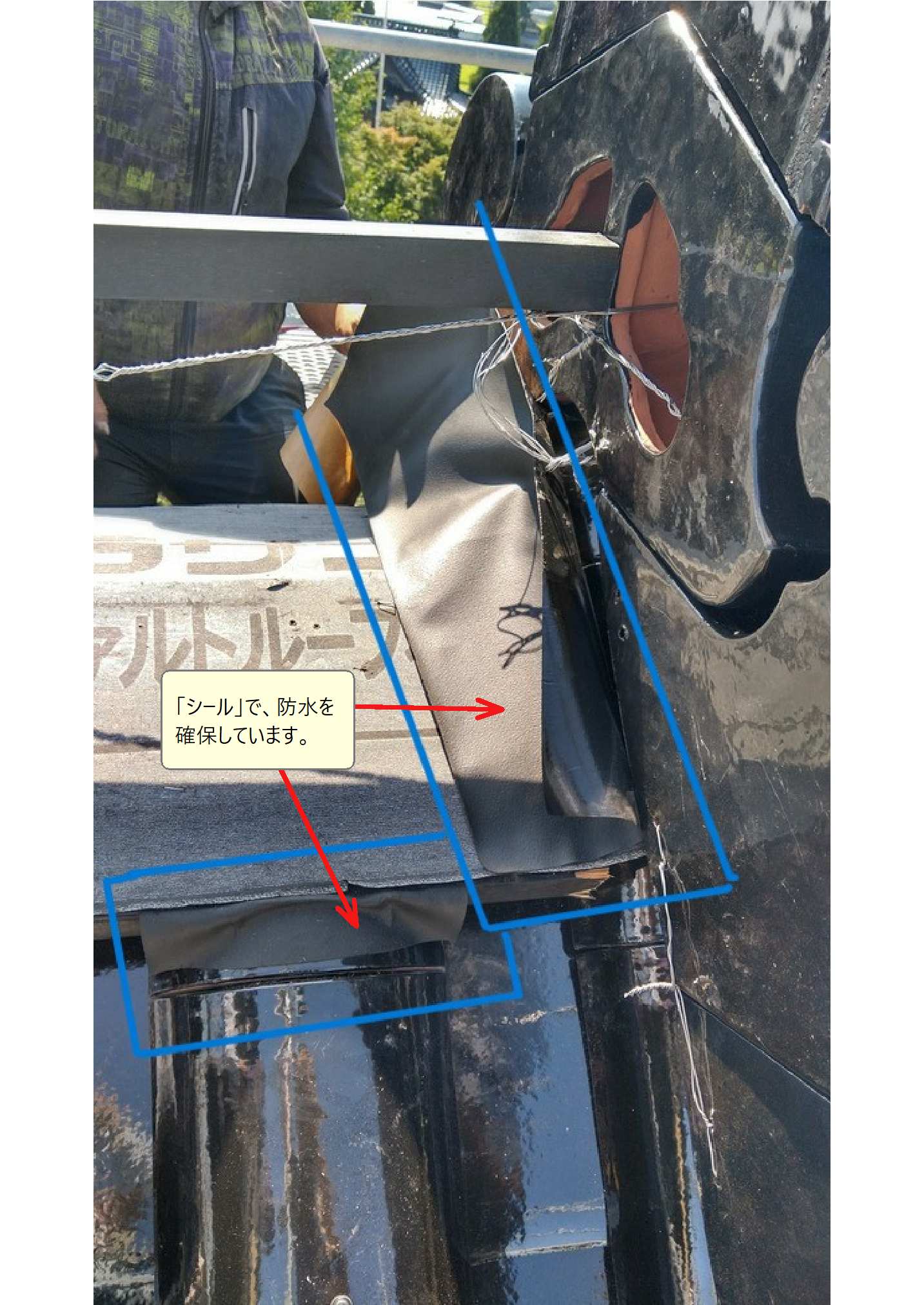 予め、緊結線を鬼瓦に通しておきます。通す部位が、狭いので時間と労力を要します。