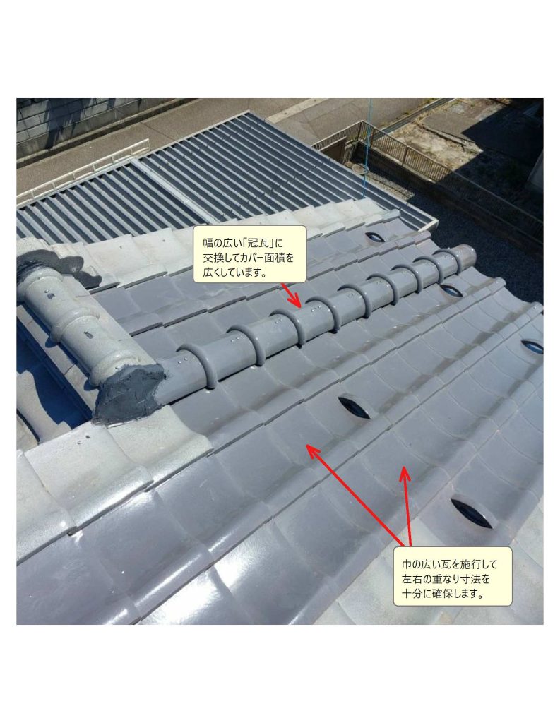 瓦の巾の重なり寸法が少ない問題に対応するため「幅の広い瓦」や「大きい冠瓦」を施工して、十分なカバーを確保しました。