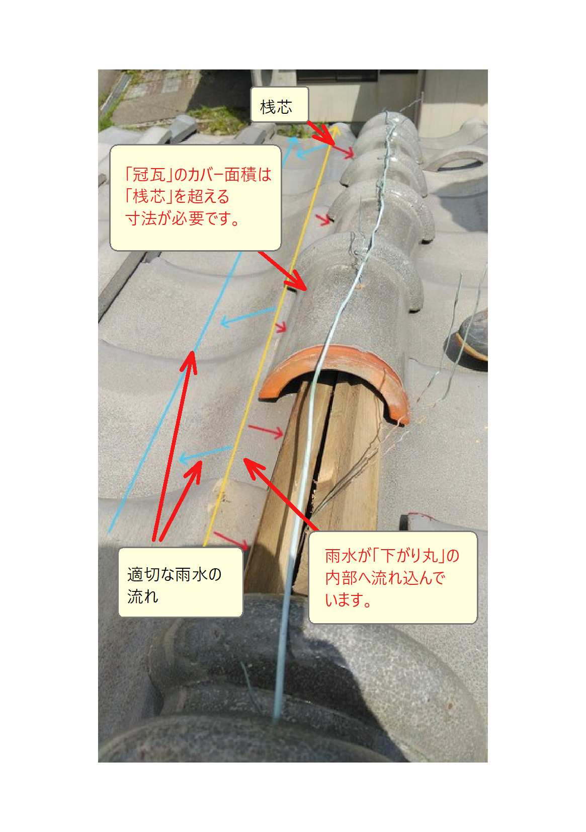 今回の問題は「冠瓦」が、瓦の一番高い部分である「桟芯・さんしん(黄色ライン)」までカバーできていない事です。