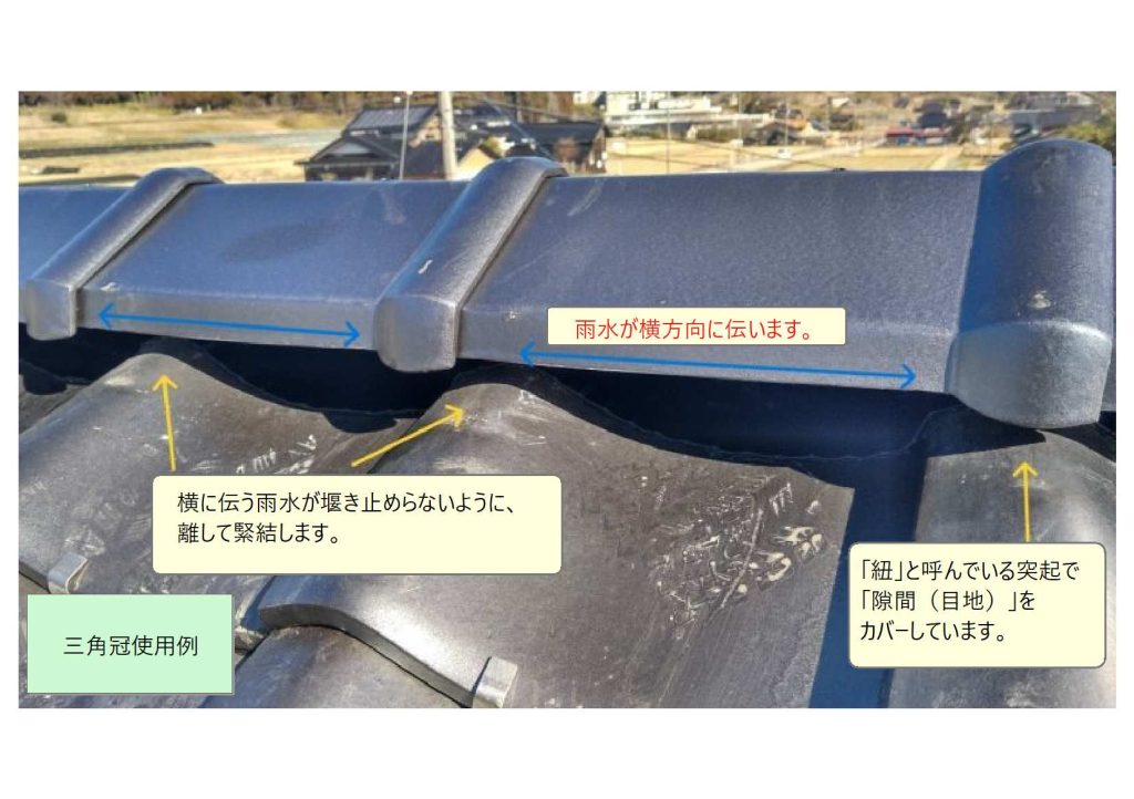 斜め方向の棟「隅棟」の場合は、三角形の瓦を「勝手瓦」と呼んでいます。