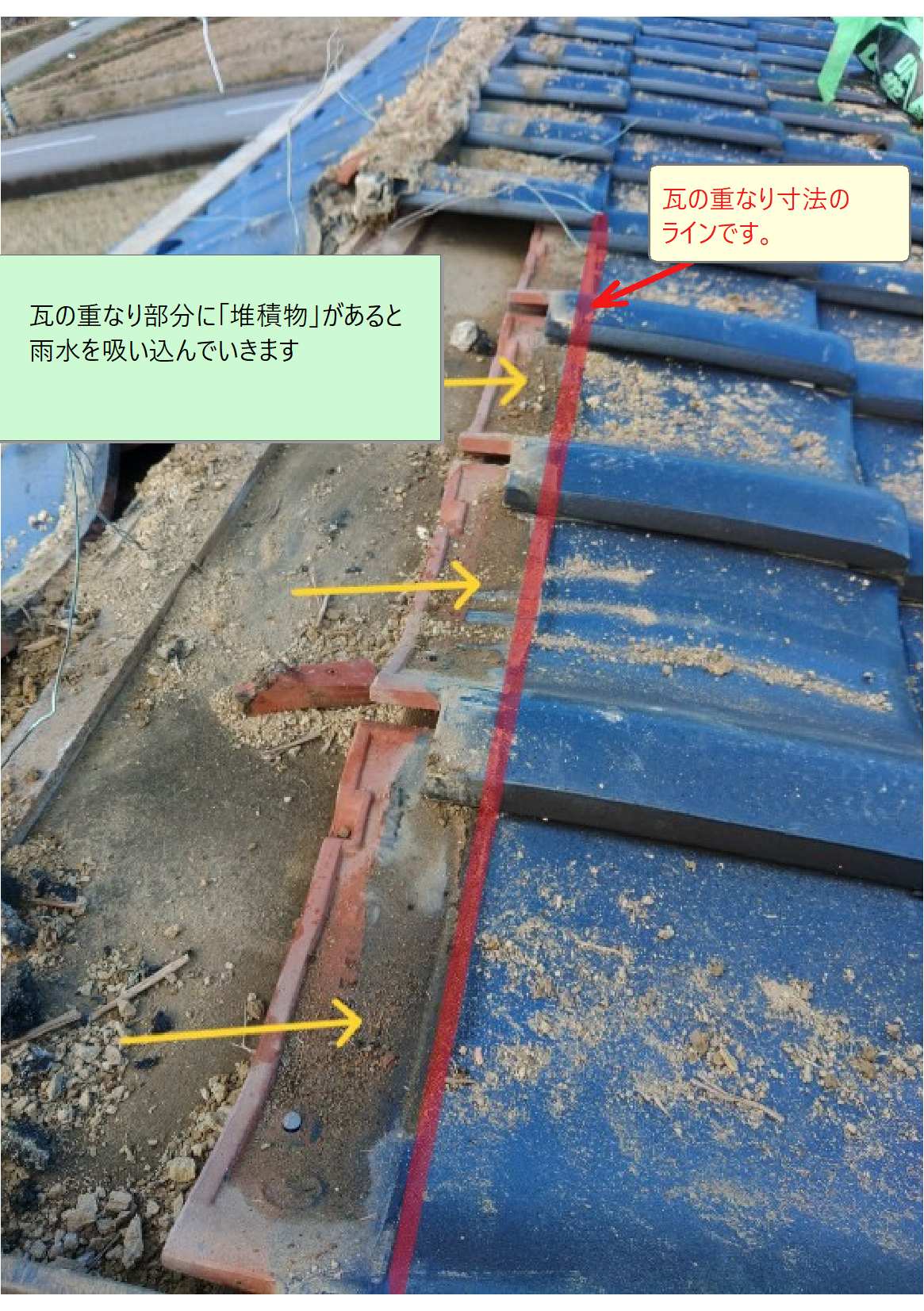 瓦の重なり部分(赤色ラインより上)でも、棟土等があると、雨水を吸い上げるので、しっかりと清掃します。
