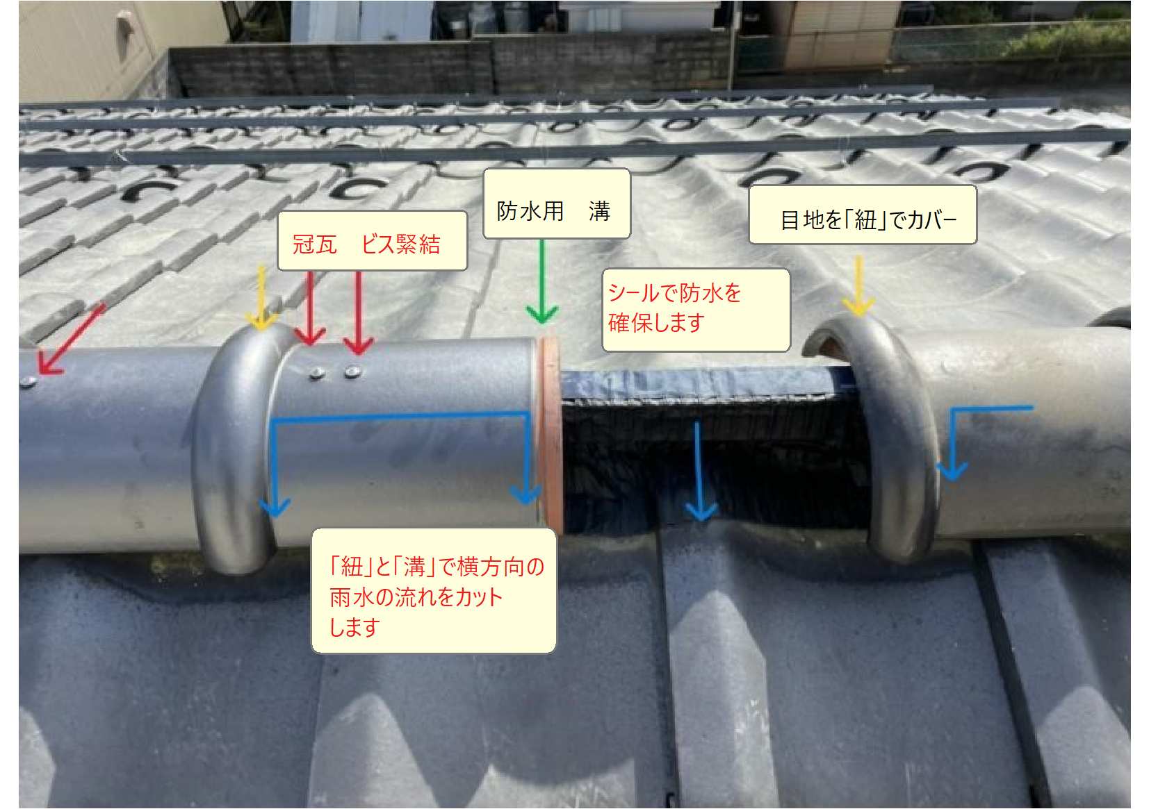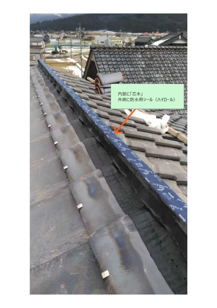 「冠瓦」を伝う水が堰き止められる事が原因での裏漏りを防ぐために、棟部の仕様に関わらず、必ず「棟部の瓦」と「瓦葺き部」は、離します。