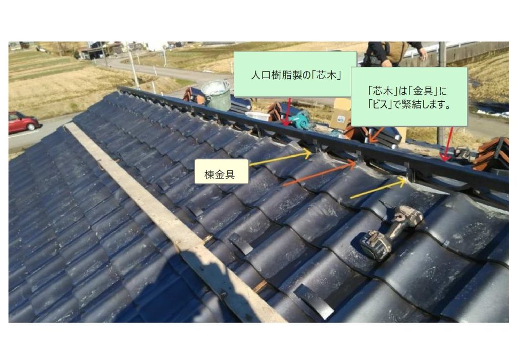 「金具」に「芯木」を取り付けます。「芯木」には、冠瓦を緊結するので、腐食に強い「人工樹脂製」の商品を採用しています。