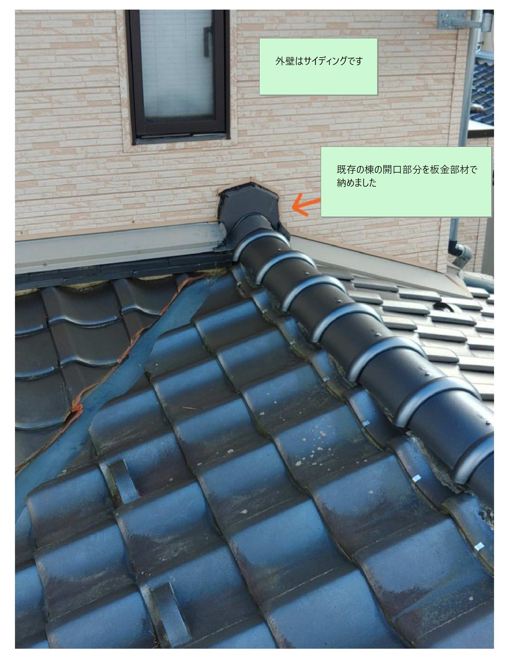 外壁工事を伴わない工事では、棟部の仕様の変更に伴って「棟部」と「外壁」との「取り合い」に開口ができてしまいます。