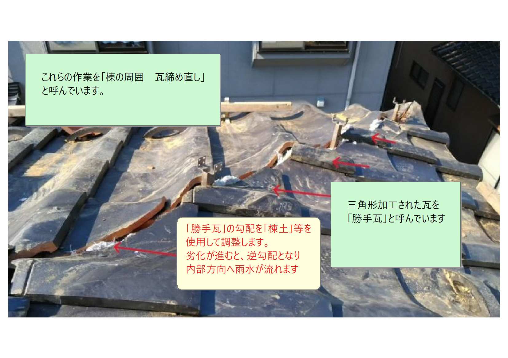 「勝手瓦」の勾配の調整には「棟土」を使用します。開口が空きすぎている等の場合は交換します。